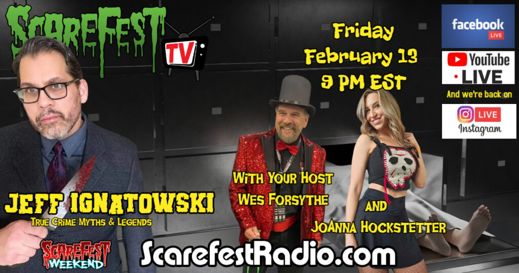 You Are Here! This Week on Scarefest TV This livestream may be on a delay. It should go LIVE by 9:05 Eastern Time on Fridays. And here are the latest archives we have uploaded Archives The Council for February SF2026 E6 February 6, 2026 Archives One of Those BS Episodes SF2026 E5 January 30, 2026 Archives Author Katherine Hale-Stringfield SF2026 E4 January 23, 2026 Archives Psychic Medium Patti Negri SF2026 E3 January 16, 2026 Archives Katie Jo Glesing and Dark Tourism SF2026 E2 January 9, 2026 Archives The Council for January SF2026 E1 January 2, 2026 Archives Christmas Call-In SF2025 E47 December 26, 2025 Archives Scarefest TV Annual Holiday Episode SF2025 E46 December 19, 2025 Archives Shane Pittman of Paranormal Mysteries SF2025 E45 December 12, 2025 Archives The Council for December SF2025 E44 December 5, 2025